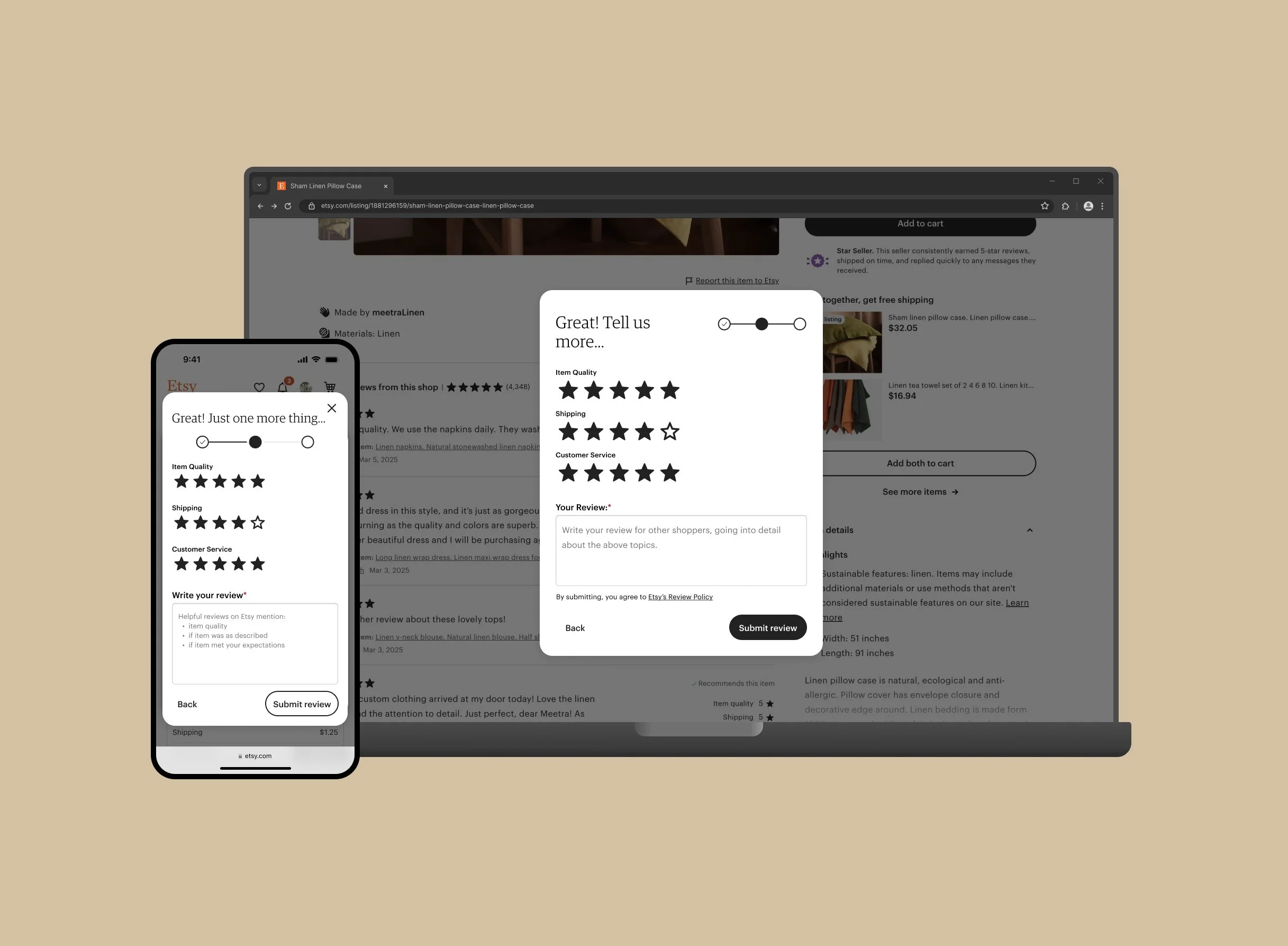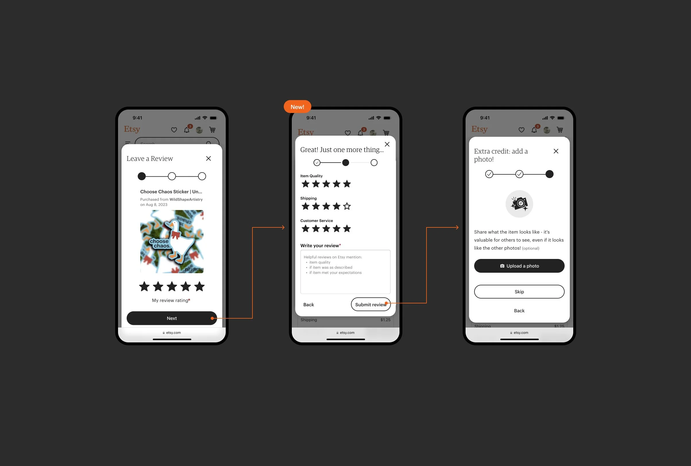 Prior to launching our experiment, subratings were being collected only on the Etsy app but weren’t displayed anywhere. This meant that we could use the existing subratings to quickly probe into the value on the display side, without having to modify any submission flows. This was a key point in our strategy to quickly gain directional signal on the value of subratings to end users.